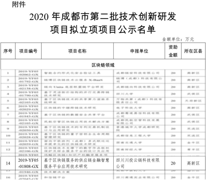 5月8日,川投信產(chǎn)所屬川投云鏈公司申報的“基于區(qū)塊鏈服務(wù)的供應(yīng)鏈金融智慧服務(wù)平臺應(yīng)用技術(shù)研究項目”,順利通過成都市科技局技術(shù)創(chuàng)新研發(fā)項目公示。作為成都市2020年第二批21項重點研發(fā)項目,將獲得20萬元的專項資金支持。