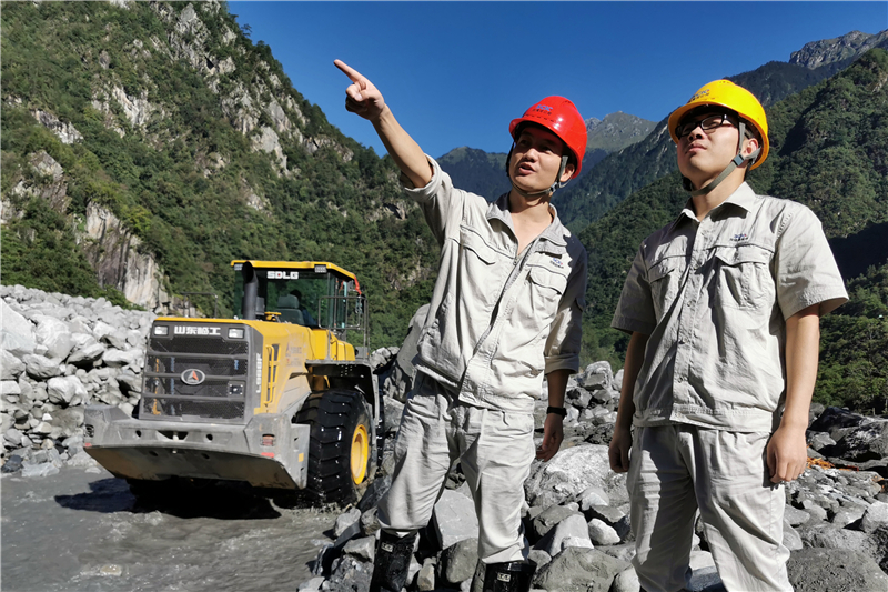 8月24日天剛亮,水工部專業(yè)人員在對作業(yè)工人進行了安全技術交底;確認周圍環(huán)境沒有安全隱患后,通知道路維護單位大型工程機械進場,電站現(xiàn)場主干道公路路面泥石流清淤開挖啟動。由于搶險現(xiàn)場仍然有降雨,一方面搶險工作緊張有序開展;另一方面水工部專人持續(xù)監(jiān)視龔家溝河道來水,預防河水忽然上漲或者中斷,確保作業(yè)人員人身安全。