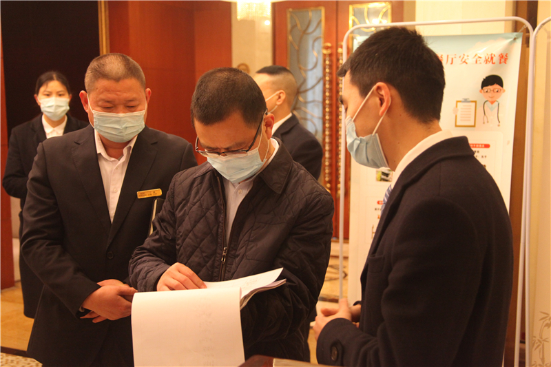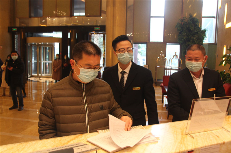 楊書記一行深入公司東大門、員工宿舍、酒店,詳細(xì)檢查了東大門疫情防控工作和廚房食品留樣記錄,并抽問了酒店前臺工作人員入住登記流程。