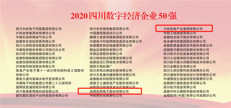 1月7日,2020四川企業(yè)100強(qiáng)發(fā)布會(huì)在成都舉行,川投信產(chǎn)成功入選2020年“四川數(shù)字經(jīng)濟(jì)企業(yè)50強(qiáng)”“四川服務(wù)業(yè)企業(yè)100強(qiáng)”及“四川數(shù)字經(jīng)濟(jì)成長型企業(yè)”3項(xiàng)榜單。川投信產(chǎn)所屬宏明電子榮獲“2020四川制造業(yè)企業(yè)100強(qiáng)”和“2020四川數(shù)字經(jīng)濟(jì)企業(yè)50強(qiáng)”。