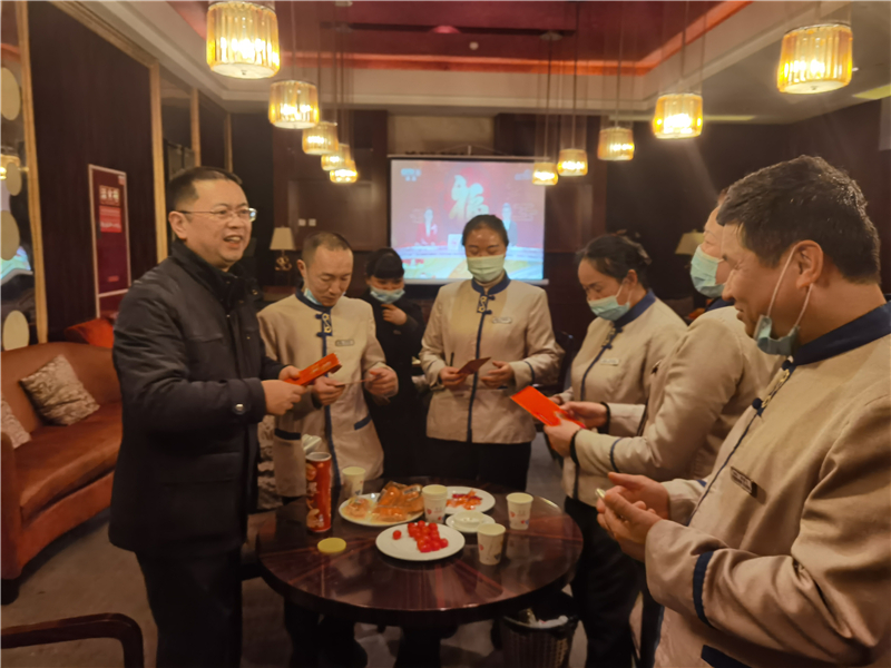 2月11日、12日農(nóng)歷除夕、大年初一,川投國(guó)網(wǎng)公司黨委副書(shū)記、工會(huì)主席楊一率隊(duì)對(duì)春節(jié)期間酒店、場(chǎng)館、東門(mén)崗?fù)ぁ㈠仩t房等各點(diǎn)位在崗職工進(jìn)行了走訪慰問(wèn)。