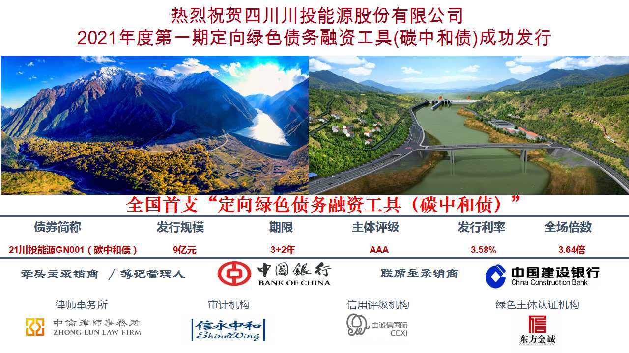 7月15日,四川川投能源股份有限公司成功發(fā)行2021年度第一期定向綠色債務融資工具(碳中和債)(簡稱:21川能投GN001,代碼:q21071406.IB),本次發(fā)行金額9億元,期限3+2年,票面利率3.58%,屬目前同期限同定向債務融資工具的全國最低價格。募集資金將專項用于收購亭子口水利工程項目20%股權。