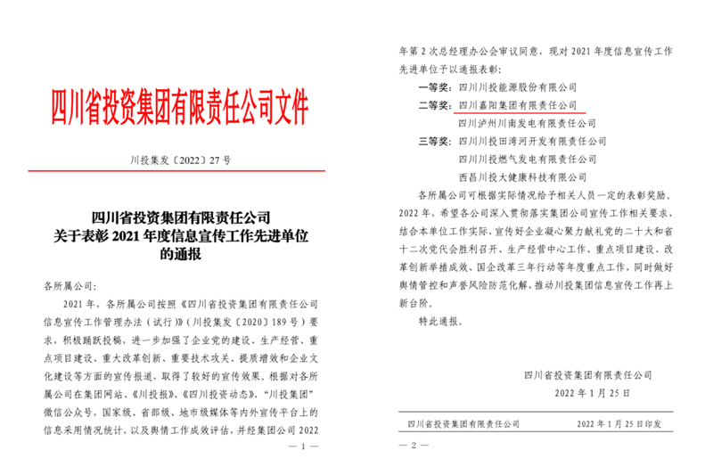 碩果累累,喜訊連連。1月25日,川投集團召開2022年度工作會,會議表彰了2021年度經(jīng)營業(yè)績突出貢獻單位和信息宣傳工作先進單位,嘉陽集團公司喜獲兩項榮譽。