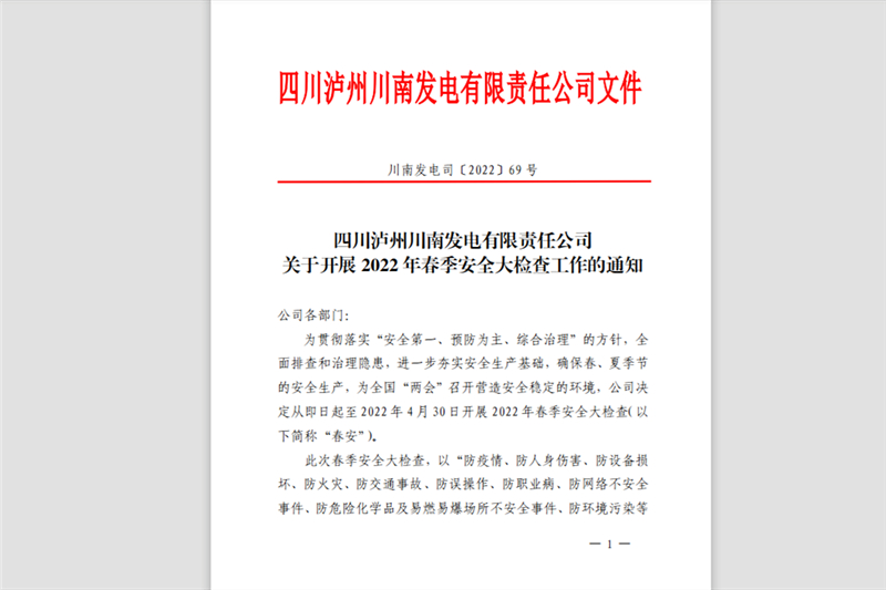近日,川南發(fā)電公司印發(fā)了《關(guān)于開展2022年春季安全大檢查工作的通知》,啟動了2022年度春季安全大檢查工作。檢查工作分為全面檢查、集中攻關(guān)整改和檢查驗收三個階段,將持續(xù)開展至4月30日。