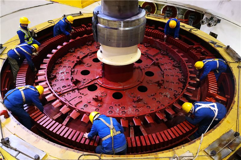 轉(zhuǎn)子起吊前,監(jiān)理組專業(yè)技術(shù)人員會同施工方對橋機進行了聯(lián)合檢查,對轉(zhuǎn)子吊裝的各項準(zhǔn)備工作進行再次確認(rèn),確保轉(zhuǎn)子具備吊裝條件。下午15時,各項安全保障措施準(zhǔn)備就緒,施工負(fù)責(zé)人向李紅匯報各項準(zhǔn)備工作并申請轉(zhuǎn)子吊裝作業(yè)?!白屑?xì)檢查并做好各項安全監(jiān)護工作,同意起吊!”李紅鏗鏘有力地說道。經(jīng)過近兩個小時持續(xù)奮戰(zhàn),重約260噸的轉(zhuǎn)子平穩(wěn)地放在基坑內(nèi)下機架上,隨著起重總指揮的最后一聲“停止”哨響,標(biāo)志著金窩電站二號機組轉(zhuǎn)子吊裝工作順利結(jié)束,金窩電站二號機組大修工作的又一關(guān)鍵性節(jié)點目標(biāo)完成。同時,發(fā)電機導(dǎo)軸承改造、平鈍噴針頭技改等重點工作也正穩(wěn)步推進。