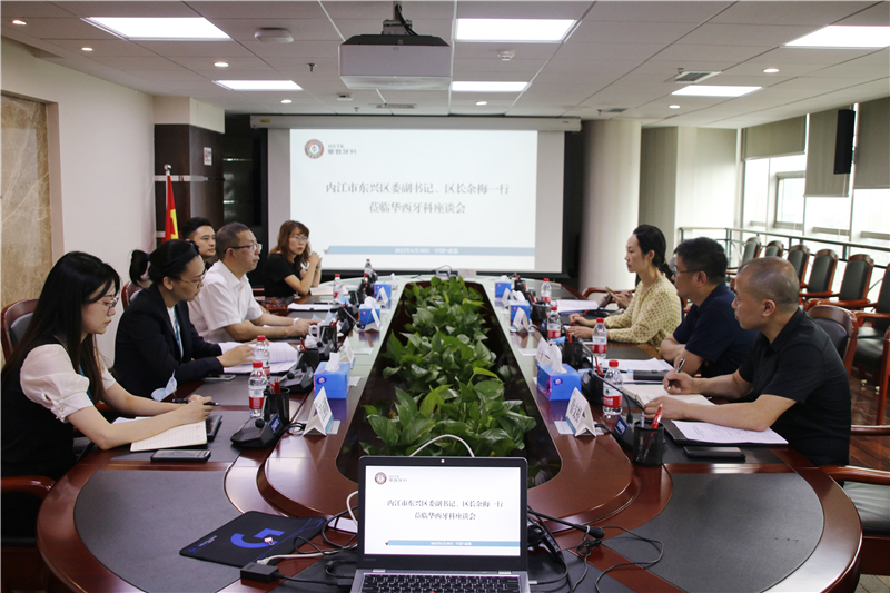 6月30日上午,內(nèi)江市東興區(qū)委副書(shū)記、區(qū)政府區(qū)長(zhǎng)余梅,副區(qū)長(zhǎng)王恒,投資促進(jìn)中心主任榮蓉,經(jīng)濟(jì)合作局副局長(zhǎng)徐支根一行赴華西牙科考察調(diào)研。華西牙科黨委書(shū)記、董事長(zhǎng)劉凌云,華西牙科總經(jīng)理助理、四川口腔醫(yī)院董事長(zhǎng)朱倫倫,華西牙科經(jīng)營(yíng)管理部部長(zhǎng)、四川口腔醫(yī)院常務(wù)副院長(zhǎng)向彩榮、華西牙科戰(zhàn)略投資部部長(zhǎng)鄒芝陪同。