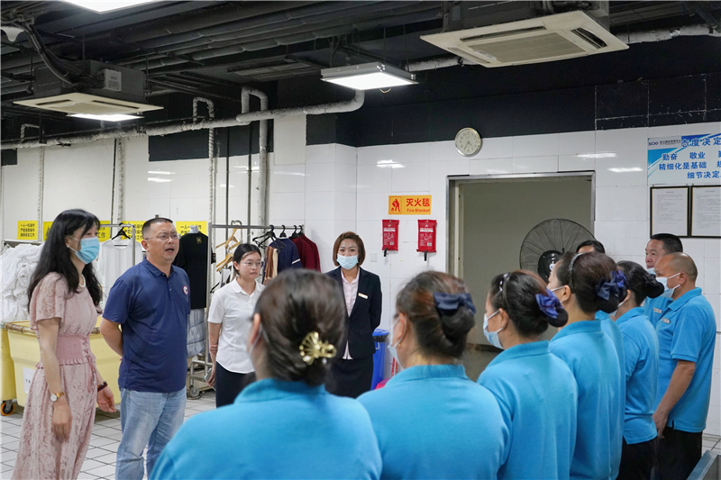 7月13日,川投國(guó)網(wǎng)公司黨委書記、執(zhí)行董事、總經(jīng)理?xiàng)钜?,黨委委員、副總經(jīng)理白蕾帶隊(duì)到川投國(guó)際酒店洗衣房、場(chǎng)館部綜合館等一線工作區(qū)域,為奮戰(zhàn)在高溫一線的勞動(dòng)者們送上一份清涼、一份關(guān)懷。