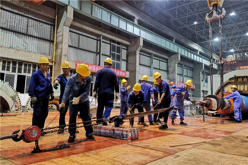 發(fā)電機抽轉子是發(fā)電機檢修的關鍵一環(huán),檢修精度高、操作難度大、風險系數高,工藝要求十分嚴格,是整個檢修工作中難度最大的一項工作,更是對檢修人員技術水平以及配合能力的全方位考驗。為保障發(fā)電機轉子安全按期抽出,公司相關部門竭誠盡智協(xié)調人力物力,專業(yè)組成員一絲不茍確認開工條件,各相關部門負責人、專業(yè)組組長始終堅守現(xiàn)場。19日19時,2號發(fā)電機抽轉子工作正式開始,作業(yè)人員嚴密監(jiān)視汽勵兩端定轉子、轉子護環(huán)、端部線圈等重要部位,不斷調整定轉子間隙,防止發(fā)生剮蹭,確保抽吊全過程安全可控。22時,發(fā)電機轉子隨著攬繩牽引緩慢移出,平穩(wěn)出膛,安全轉移至轉子托木上,抽轉子工作順利完成。