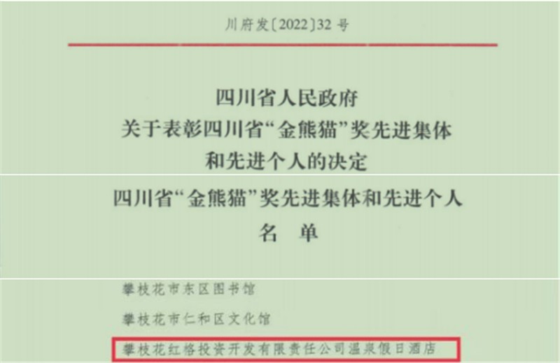 近日,四川省人民政府發(fā)布《關(guān)于表彰四川省“金熊貓”獎(jiǎng)先進(jìn)集體和先進(jìn)個(gè)人的決定》,對(duì)全省100個(gè)集體和200名個(gè)人予以“金熊貓”獎(jiǎng)表彰。川投大健康產(chǎn)業(yè)集團(tuán)所屬攀枝花紅格投資開(kāi)發(fā)有限責(zé)任公司(以下簡(jiǎn)稱(chēng)紅投公司)紅格溫泉假日酒店(以下簡(jiǎn)稱(chēng)假日酒店)上榜先進(jìn)集體,抱回一只“金熊貓”。在本次獲獎(jiǎng)名單中,飯店性質(zhì)的獲獎(jiǎng)單位僅有假日酒店與四川省人民政府金牛賓館兩家獲此殊榮。