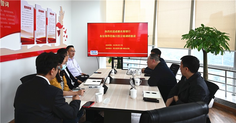 3月17日,成都農(nóng)村商業(yè)銀行總行普惠金融部總經(jīng)理王繼東、雙流支行行長鄺光勝一行赴川投信產(chǎn)所屬川投云鏈調(diào)研。