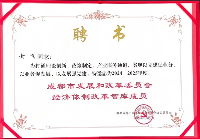 2023年5月28日,由中共成都市發(fā)展和改革委員會機關(guān)委員會主辦,四川廣播電視臺廣播傳媒中心、四川銀鏈企科技發(fā)展有限公司承辦的“企業(yè)家面對面交流會暨成都市發(fā)改委經(jīng)濟體制改革智庫成員(2024—2025年度)聘書頒發(fā)儀式”在成都舉行。