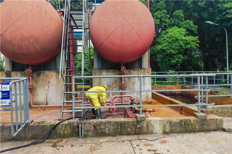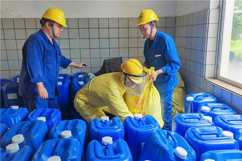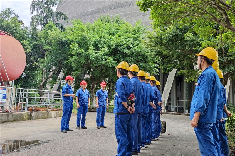 “匯報主值,循環(huán)水濃硫酸槽車接卸過程中,卸酸泵進口管道接頭突然大量泄漏濃硫酸,并有少量濃硫酸灑落在圍堰外,可能造成環(huán)境污染”,隨著對講機傳來一陣急促的聲音,演習正式開始?;蛋鄦T發(fā)現泄漏后,第一時間切斷卸酸泵電源,要求槽車司機穿戴好防護用品后關閉槽車緊急關斷閥,對卸酸系統(tǒng)進行有效隔離后駛離至安全地帶,同步疏散無關人員,并匯報值長現場濃硫酸泄漏情況。值長接到匯報后立即安排檢修及運行支援人員到場協(xié)同處置,化水值班員穿戴好防護用品進入泄漏點進行系統(tǒng)隔離,用現場存放的消石灰封堵并中和外漏濃硫酸,沖洗圍堰內泄漏余酸,并將圍堰內積水轉運至運行中的涼水塔,防止造成環(huán)境污染。