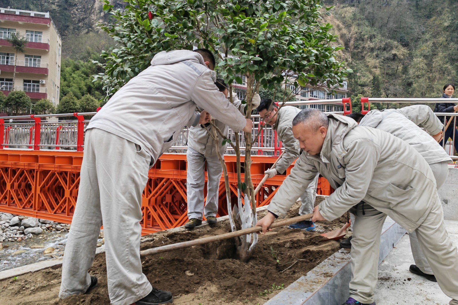 活動現(xiàn)場,大家熱情洋溢、干勁十足。搬運樹苗、揮鍬鏟土、扶樹填坑、培土圍堰、提水澆灌,每一個步驟都充滿了歡聲笑語,現(xiàn)場呈現(xiàn)出一派熱火朝天的熱鬧景象。大家精心協(xié)作,共種植了繡球、玉蘭、桂花、茶花、凌霄花等樹苗20余棵,為現(xiàn)場營地增添了一道靚麗的風景線。