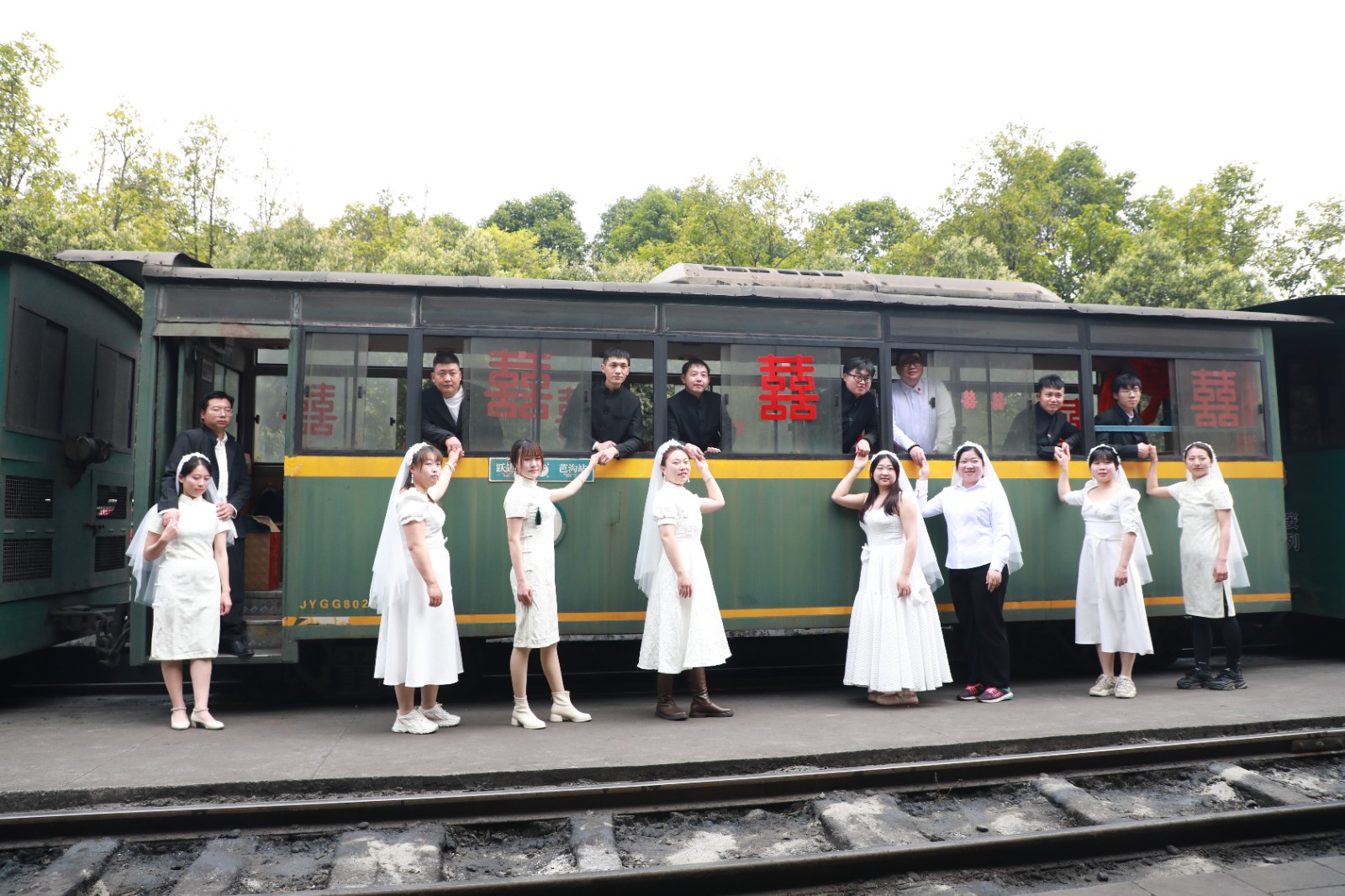 3月12日下午,來自川渝地區(qū)的多對新人盛裝抵達嘉陽小火車躍進站,攜手跨過象征著“歷久彌新”的鐵軌,登上寓意著“長長久久”的小火車車廂,在氣勢磅礴的汽笛聲中,向著旖旎秀美的幸福彼岸啟程。新婚燕爾的佳偶們,還在段家灣景點的金色花海前,回應小火車的鳴笛致意,讓這如畫的春景為美好姻緣做出見證。
