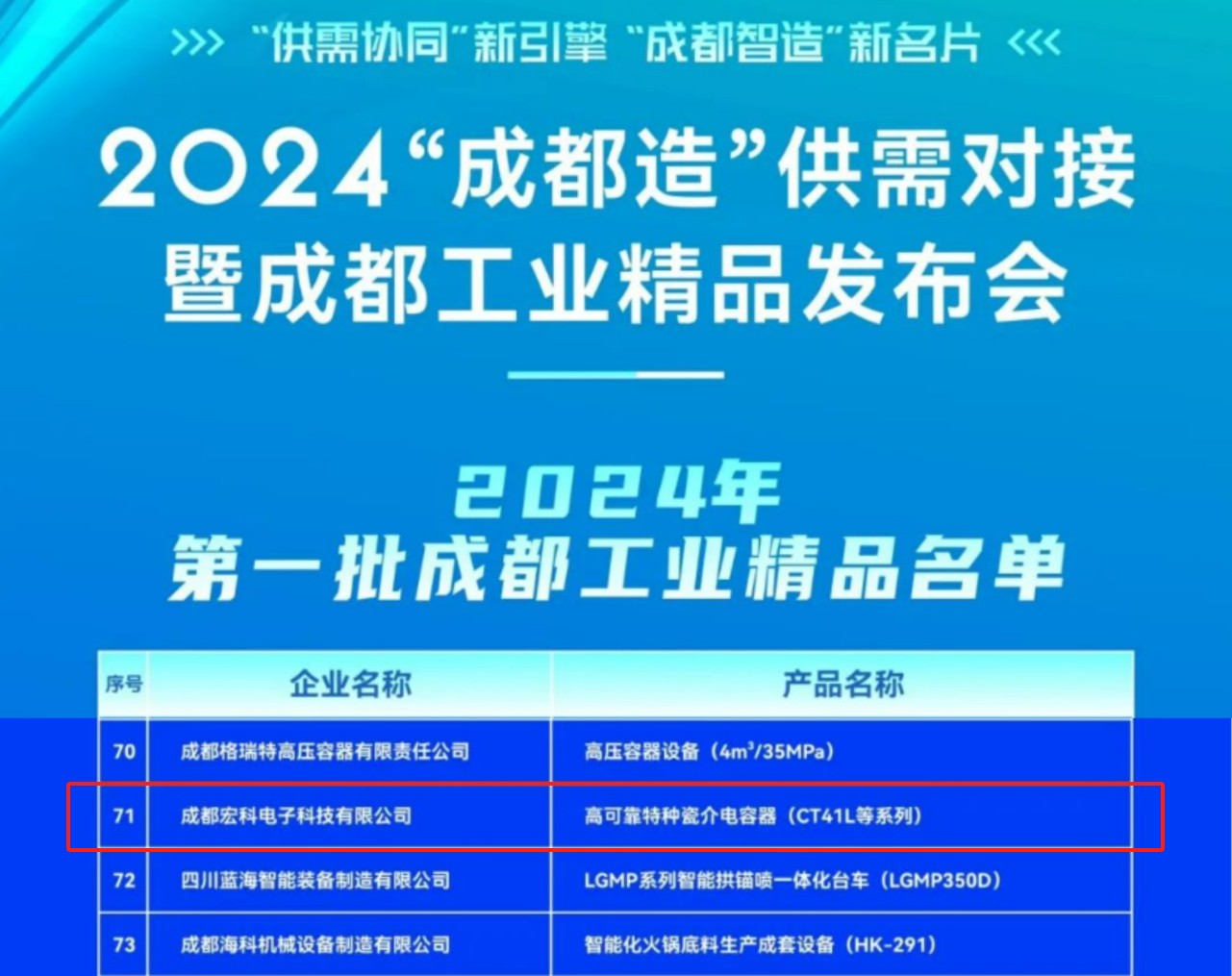 據(jù)悉,本次活動(dòng)由成都市經(jīng)濟(jì)和信息化局市新經(jīng)濟(jì)發(fā)展委員會(huì)(成都市扶持名優(yōu)產(chǎn)品領(lǐng)導(dǎo)小組辦公室)主辦,旨在推動(dòng)“成都造”企業(yè)增品種、提質(zhì)量、創(chuàng)品牌,加快成都產(chǎn)品向成都品牌轉(zhuǎn)變。第一批成都工業(yè)精品共評(píng)選認(rèn)定100家企業(yè)的100項(xiàng)產(chǎn)品,宏明宏科憑借高可靠特種瓷介電容器(CT41L等系列)產(chǎn)品成功入選。
