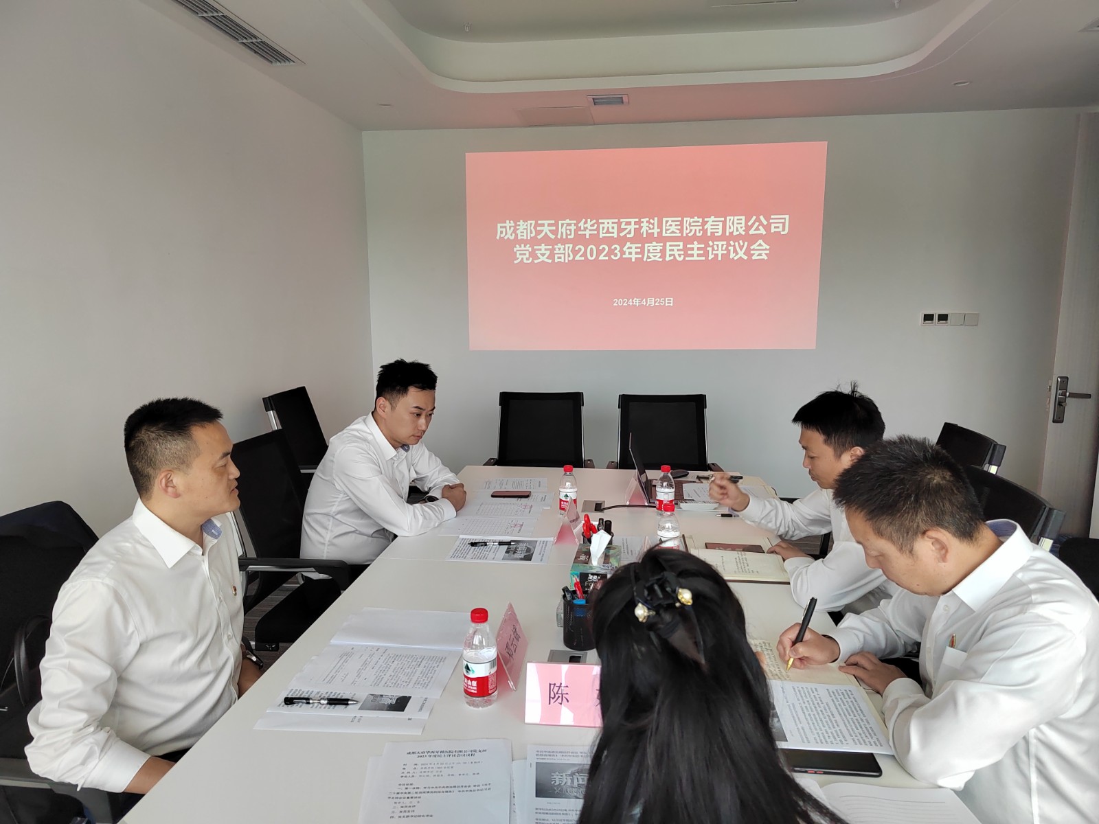 4月25日,天府華西牙科黨支部召開2023年度民主評議會議。天府華西牙科公司黨支部書記蘭吉主持會議,華西牙科黨委委員、紀委書記鄧云斌以普通黨員身份出席會議,天府華西牙科全體黨員參加會議。