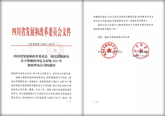 近日,省發(fā)改委、省能源局發(fā)布了《關(guān)于明確2024年保底售電公司的通知》,川投售電再次被評(píng)選為四川電力市場(chǎng)2024年保底售電公司。川投售電連續(xù)兩年獲此殊榮,是電力主管部門及各市場(chǎng)主體對(duì)川投售電經(jīng)營(yíng)能力、市場(chǎng)信譽(yù)、員工實(shí)力等各方面的認(rèn)可,更是川投售電全體干部職工腳踏實(shí)地、眾志成城、全力以赴提升公司綜合實(shí)力的具體體現(xiàn)。