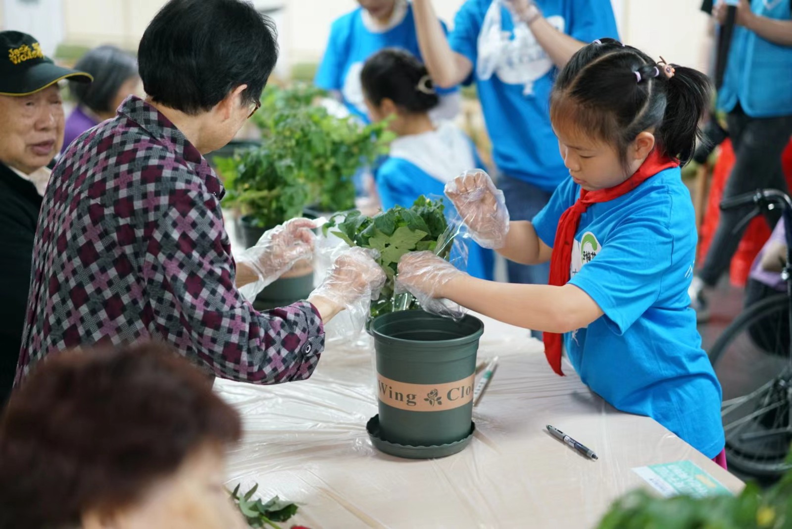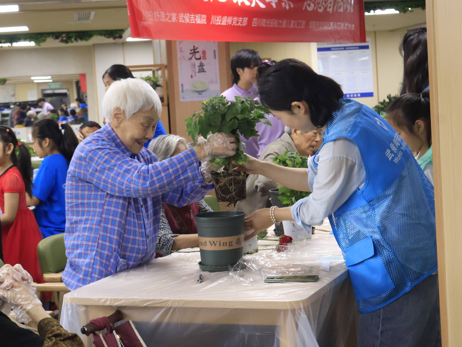 活動(dòng)上,武侯吉福院的長(zhǎng)者們與志愿者們一一結(jié)對(duì),共同種下蔬菜盆栽。長(zhǎng)者們握著志愿者們的手,對(duì)盆栽進(jìn)行施肥松土,并將祝福賀卡掛在植株上。小小盆栽,寄托著長(zhǎng)者與志愿者們共同期待收獲的美好愿景。