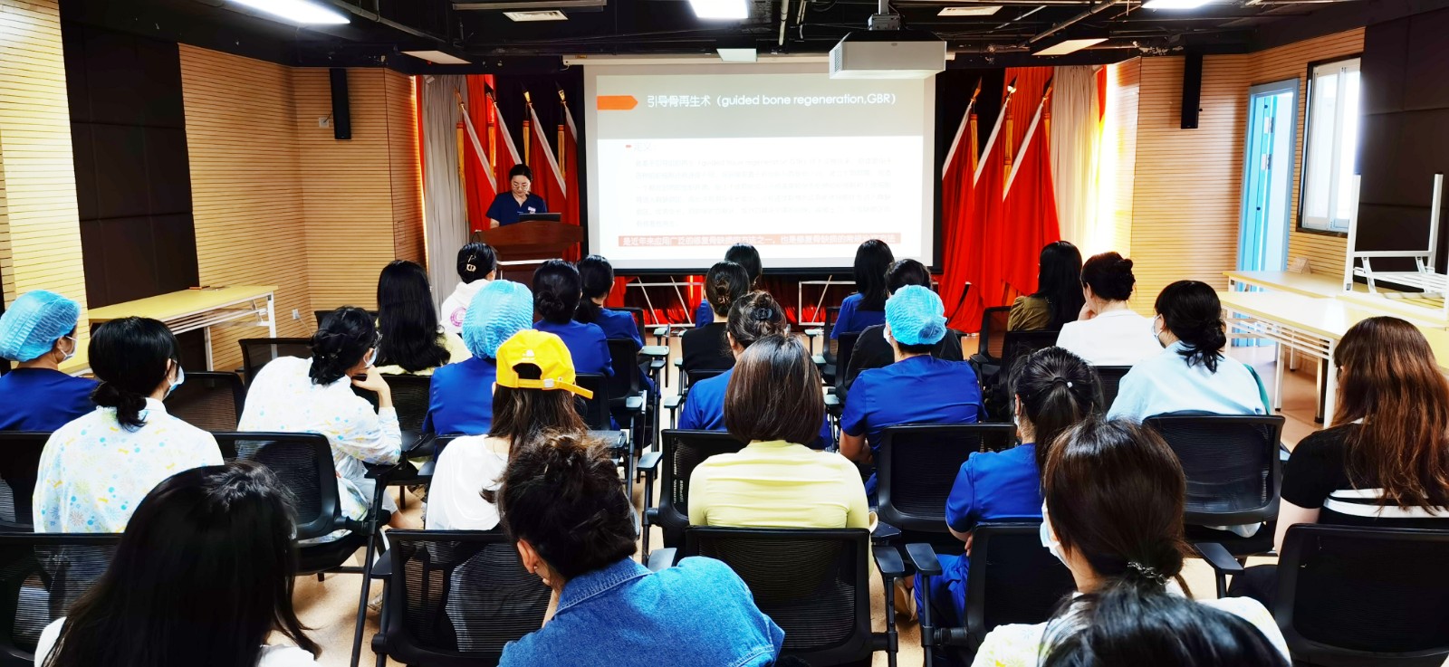 培訓(xùn)中,四川口腔醫(yī)院護(hù)理人員魏婷介紹了骨增量手術(shù),如引導(dǎo)骨再生術(shù)、上頜竇底提升術(shù)、外置法植骨術(shù)的基本原理及護(hù)理配合要點,并展示了術(shù)后可提高牙種植成功率的影像記錄。讓護(hù)理人員們進(jìn)一步加深了對口腔種植的護(hù)理配合流程的印象,從而更好地指導(dǎo)臨床工作。