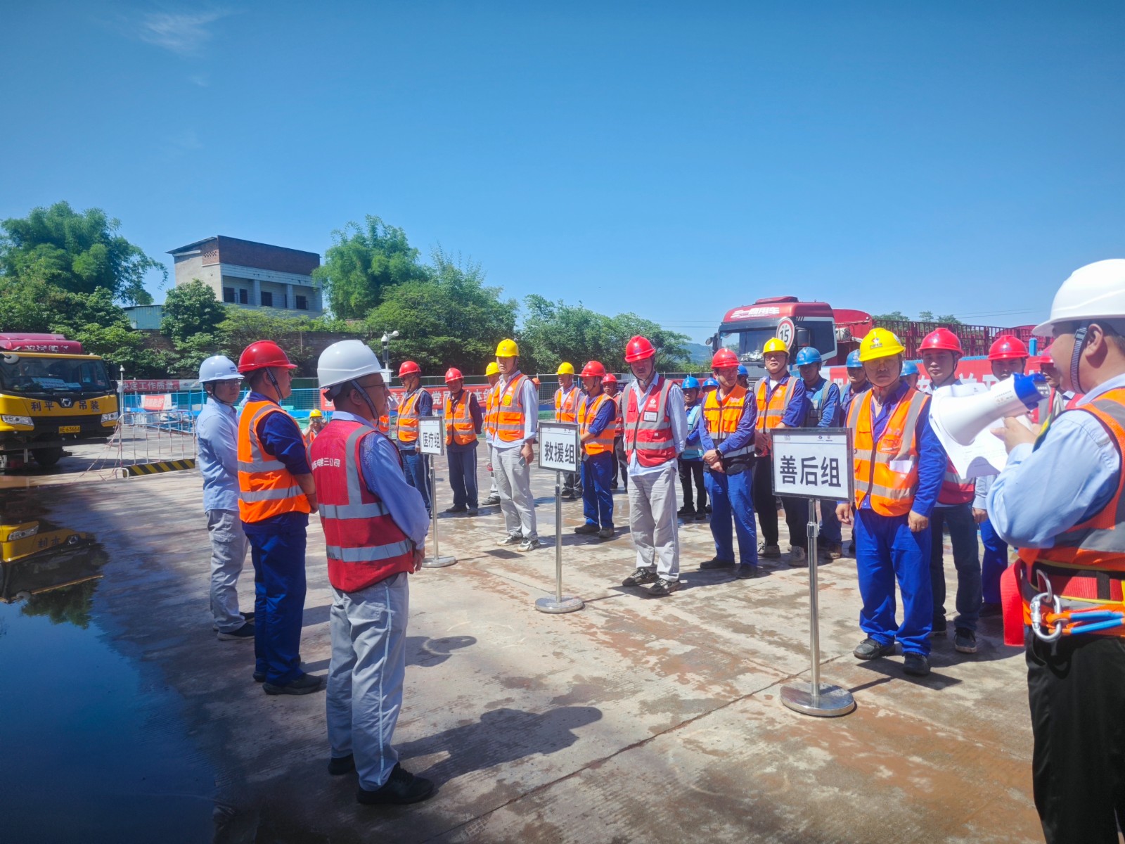本次演練分為醫(yī)療、救援、后勤、善后4個(gè)小組,采用實(shí)戰(zhàn)形式進(jìn)行演練。演練模擬場(chǎng)景為:5月13日下午,施工現(xiàn)場(chǎng)驟降暴雨造成循環(huán)水泵房北側(cè)的循環(huán)水管道基槽邊坡發(fā)生局部塌方,塌方導(dǎo)致基坑下方一名作業(yè)人員和工器具被掩埋,循環(huán)水泵房基坑內(nèi)流入大量積水,如不及時(shí)進(jìn)行抽排可能導(dǎo)致基坑邊坡浸泡發(fā)生大面積坍塌事故,需立即組織人員搶險(xiǎn)。接到險(xiǎn)情報(bào)警后,防汛應(yīng)急指揮部迅速啟動(dòng)應(yīng)急機(jī)制,第一時(shí)間組織應(yīng)急救援隊(duì)火速趕赴目標(biāo)地點(diǎn),按照防汛應(yīng)急方案,著眼實(shí)戰(zhàn),進(jìn)行了緊急救險(xiǎn)、轉(zhuǎn)移傷員、人員排查、積水抽排等應(yīng)急救援。