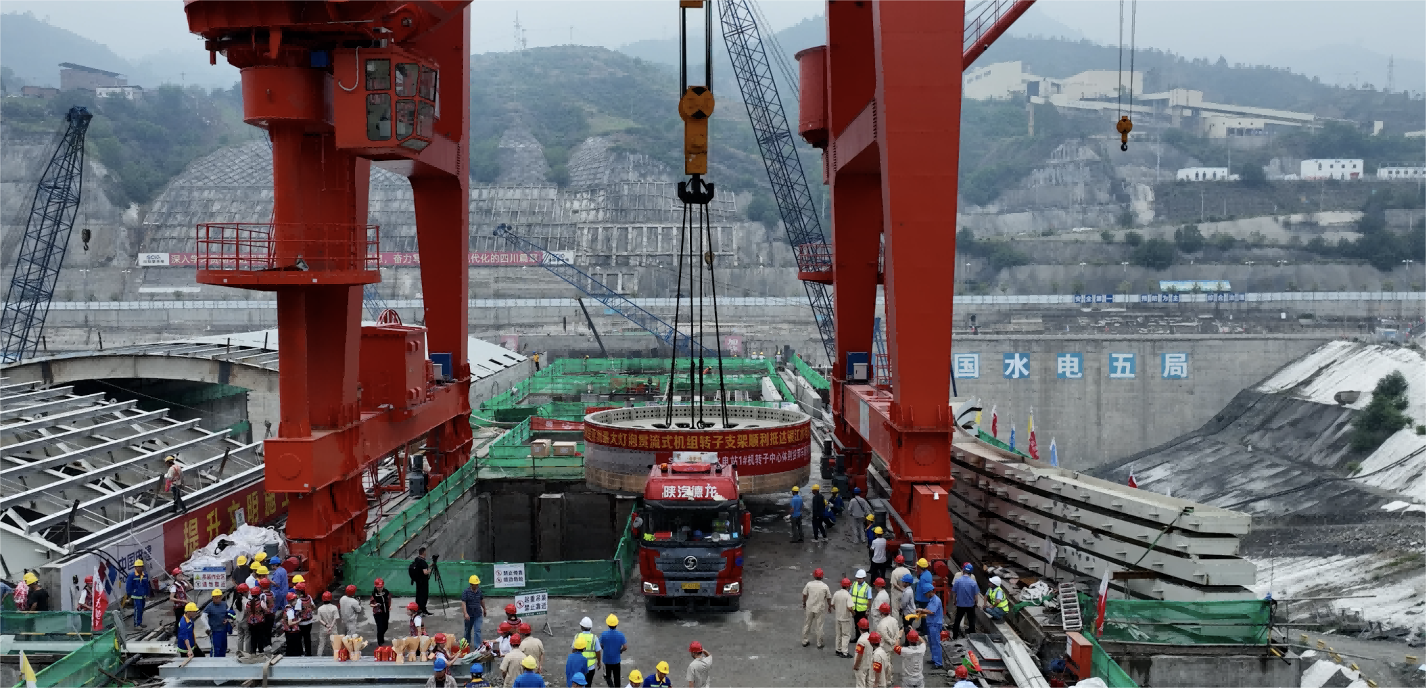 當(dāng)日上午,攀水電公司和參建單位職工齊聚壩頂,共同迎接歷經(jīng)艱難、遠(yuǎn)道而來(lái)的“重要成員”。據(jù)攀水電公司相關(guān)負(fù)責(zé)人介紹,該轉(zhuǎn)子支架具有設(shè)備巨大、運(yùn)輸困難、作用重要三個(gè)特征。設(shè)備之“重”。轉(zhuǎn)子支架直徑達(dá)8米,高2米有余,重達(dá)百余噸,是目前亞洲最大的燈泡貫流式機(jī)組轉(zhuǎn)子支架。運(yùn)輸之“難”。轉(zhuǎn)子支架于4月22日從江蘇鎮(zhèn)江碼頭開(kāi)始運(yùn)輸,先乘船再坐車,途中克服了大件超寬超限、持續(xù)降雨、道路塌方等諸多不利因素,多次調(diào)整運(yùn)輸路線,風(fēng)雨無(wú)阻,日夜兼程,歷時(shí)66天,跨越7個(gè)省份,全程3062公里,在沿途交警的護(hù)送下安全抵達(dá)。作用之“要”。轉(zhuǎn)子支架作為機(jī)組的核心部件,為磁軛一體圓盤式結(jié)構(gòu),中心體采用整圓鍛鋼與磁軛圈焊接組成,對(duì)轉(zhuǎn)子磁軛垂直度、磁軛圓度等加工精度要求極高,決定著機(jī)組的運(yùn)行性能、運(yùn)行效率和安全穩(wěn)定性。