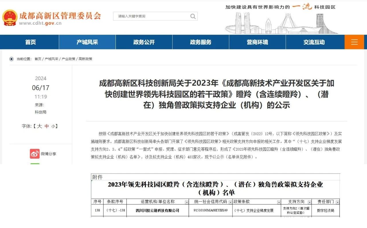 近日,成都高新區(qū)科技創(chuàng)新局公布了2023年《成都高新技術(shù)產(chǎn)業(yè)開發(fā)區(qū)關(guān)于加快創(chuàng)建世界領(lǐng)先科技園區(qū)的若干政策》瞪羚、獨(dú)角獸政策擬支持企業(yè)名單,川投信產(chǎn)所屬川投云鏈入選“瞪羚企業(yè)”,公司科技創(chuàng)新、市場表現(xiàn)、發(fā)展實(shí)力再獲權(quán)威認(rèn)可。