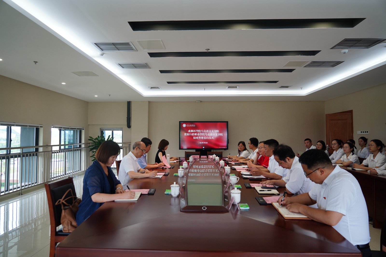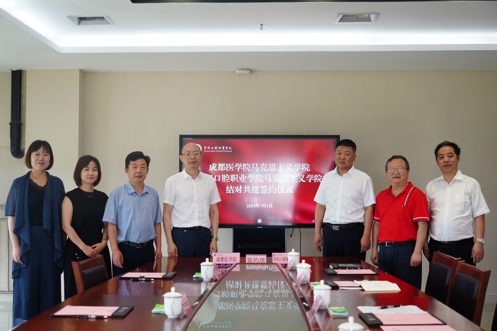 為深入貫徹習(xí)近平總書記關(guān)于思想政治理論課建設(shè)的重要論述,認(rèn)真落實中共四川省委教育工委、四川省教育廳關(guān)于開展四川省高校馬克思主義學(xué)院結(jié)對共建行動的文件精神,進(jìn)一步推進(jìn)馬克思主義學(xué)院高質(zhì)量建設(shè),近日,成都醫(yī)學(xué)院與資陽口腔職業(yè)學(xué)院簽訂結(jié)對共建馬克思主義學(xué)院協(xié)議。成都醫(yī)學(xué)院馬克思主義學(xué)院院長張俊、黨總支書記張首先,學(xué)院黨委書記、理事長張中偉,院長萬呼春、馬克思主義學(xué)院執(zhí)行院長陳思俊出席會議,學(xué)院各部門負(fù)責(zé)人、全體思政教師參加。
