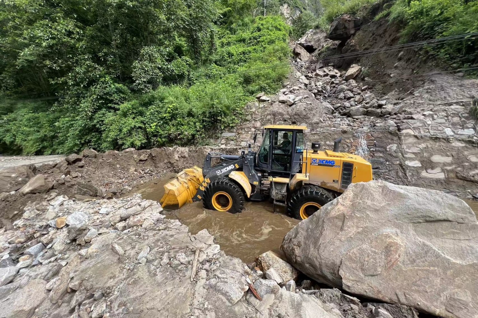 公司副總經(jīng)理、現(xiàn)場值班領導萬均強在了解情況后,第一時間啟動應急響應機制,優(yōu)先保證附近人員及設備的安全,并于7月18日一早,召集后勤管理中心、水工部人員組成應急搶險隊立即開展金窩電站道路清理疏通工作。面對2000方泥石流堆積物(其中面積最大的滾石約3方,淤積最深處厚度近3米),經(jīng)過緊急商討,應急搶險隊決定采取“兩步走”的方式在保障自身人員安全的前提下開展疏通工作。第一步,水工部現(xiàn)場安全監(jiān)督員通過查勘周圍地質(zhì)狀態(tài)對現(xiàn)場作業(yè)環(huán)境進行“診斷”,分析研判搶險作業(yè)的可行性、安全性,并在搶通作業(yè)過程中時刻觀察環(huán)境變化,為裝載機操作人員保駕護航;第二步,后勤管理中心裝載機兼職駕駛員在反復確認設備狀態(tài)、操作規(guī)程后,驅(qū)動清淤設備,分區(qū)分步開展清淤疏通工作。大家分工明確,默契協(xié)作,不畏艱險,沉著應對,現(xiàn)場搶險工作緊張有序開展。