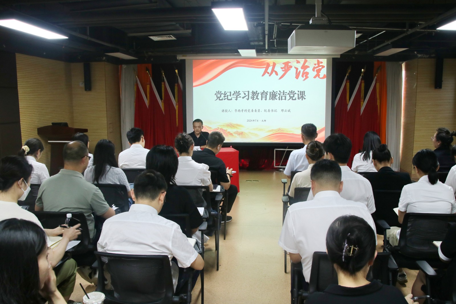 按照黨紀(jì)學(xué)習(xí)教育工作安排,7月30日,華西牙科黨委委員、紀(jì)委書記鄧云斌在四川口腔醫(yī)院13樓會議室開展了第四期“五心講堂”暨黨紀(jì)學(xué)習(xí)教育專題廉潔黨課。