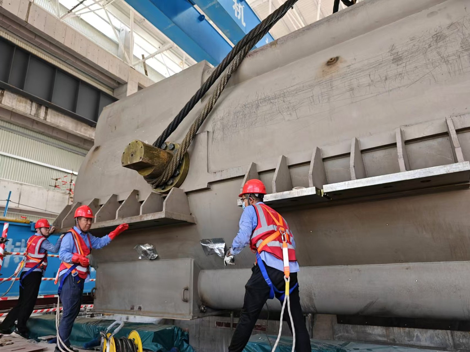 發(fā)電機(jī)定子作為主廠房內(nèi)最重的單體設(shè)備,長10.3米、寬4.868米、高4.7米,重達(dá)367噸。為確保發(fā)電機(jī)定子吊裝平穩(wěn)、就位精準(zhǔn),項目建設(shè)團(tuán)隊組織制定詳細(xì)的吊裝施工方案,提前做好設(shè)備和工器具保障,從場外運輸至場內(nèi)卸車全過程反復(fù)推演,逐項落實。同時,在吊裝期間實施全程監(jiān)督,嚴(yán)控安全質(zhì)量,確保整個吊裝過程安全、有序、可控。