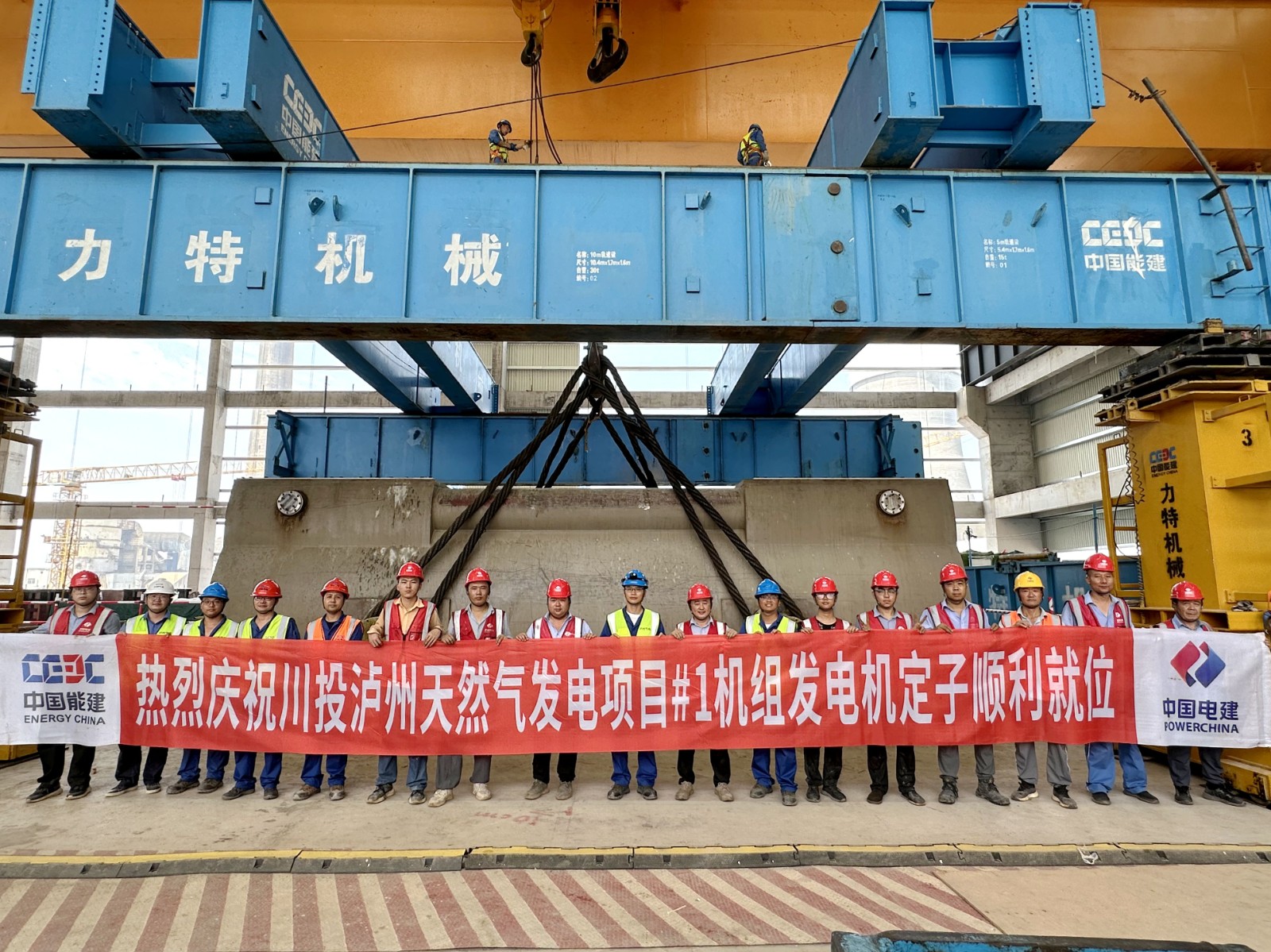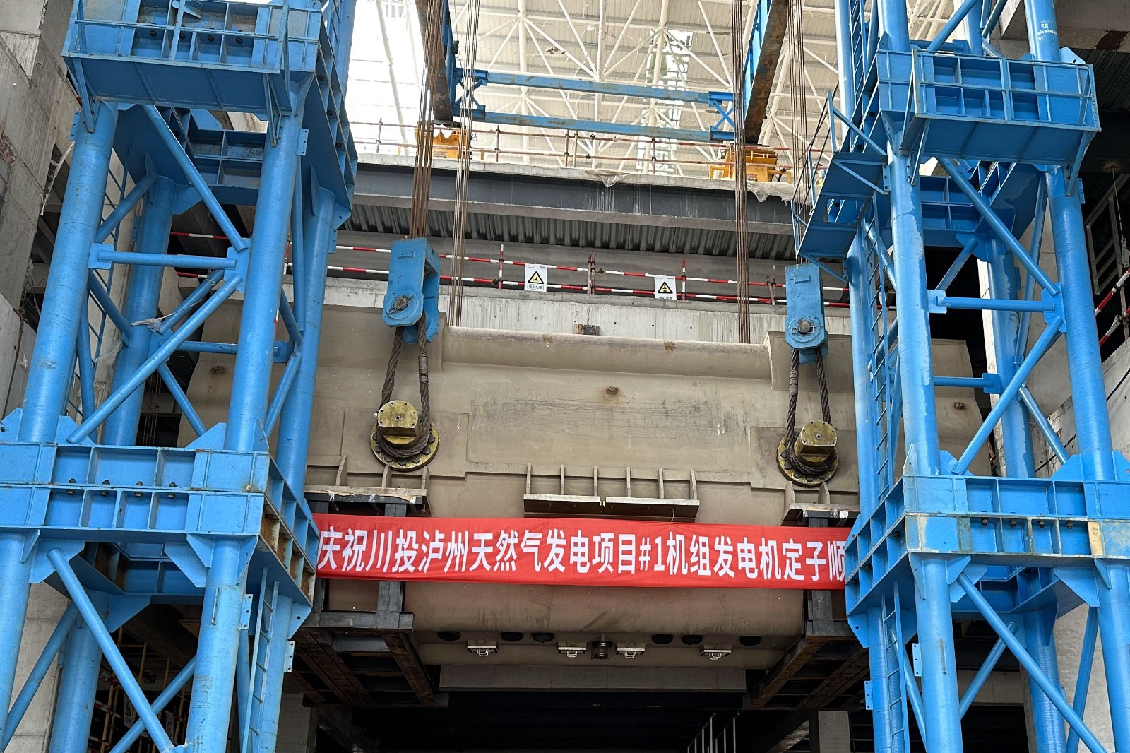 8月19日11時28分,川投瀘州天然氣發(fā)電項目1號發(fā)電機(jī)定子順利吊裝就位。